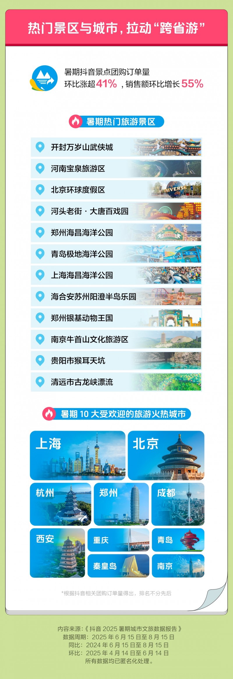 报告显示,避暑、亲子游等成为暑期文旅热门关键词,并撬动景区消费。兼具避暑、亲子游属性的上海海昌海洋公园入围“暑期热门旅游景区”。暑假期间,大量文旅达人在抖音分享上海海昌海洋公园旅游攻略,多条视频获得上万点赞。上海海昌海洋公园在抖音团购上线多种特惠票、景酒套票,吸引大量游客下单。除此以外,郑州海昌海洋公园、青岛极地海洋公园、开封万岁山武侠城、河南宝泉旅游区等景区上榜。