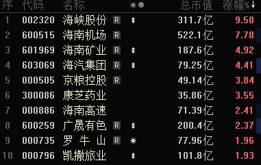 板块内海峡股份上涨9.58%,海南机场上涨7.78%,海南矿业上涨4.92%。